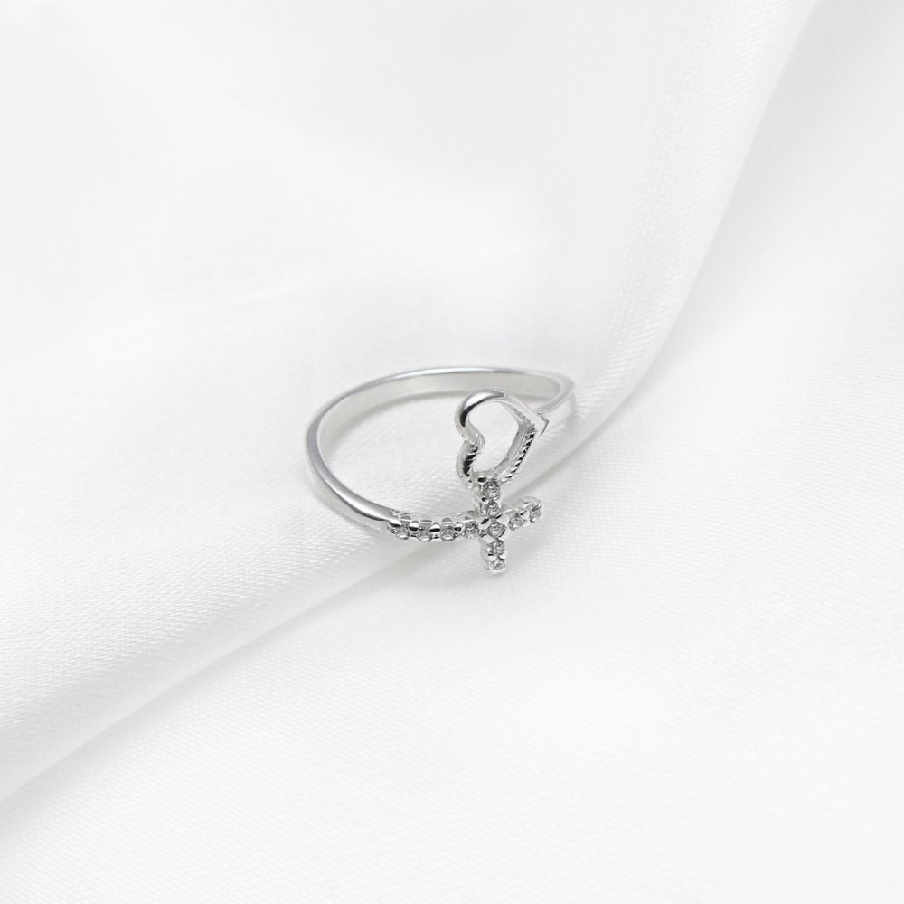Anel feito em prata com coração e uma cruz cravejada em Zircônias.