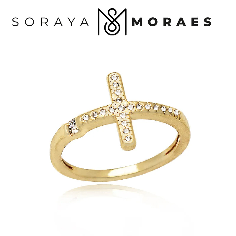 Anel em formato de cruz, cravejado com Zircônias e banhado em ouro 18k