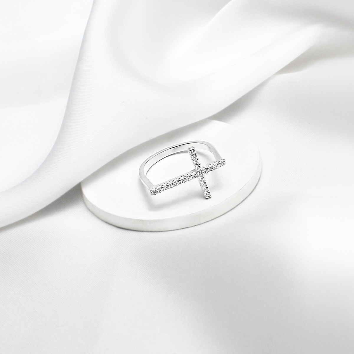 Anel no formato de uma cruz deitada, feito em prata e cravejado com Zircônias.