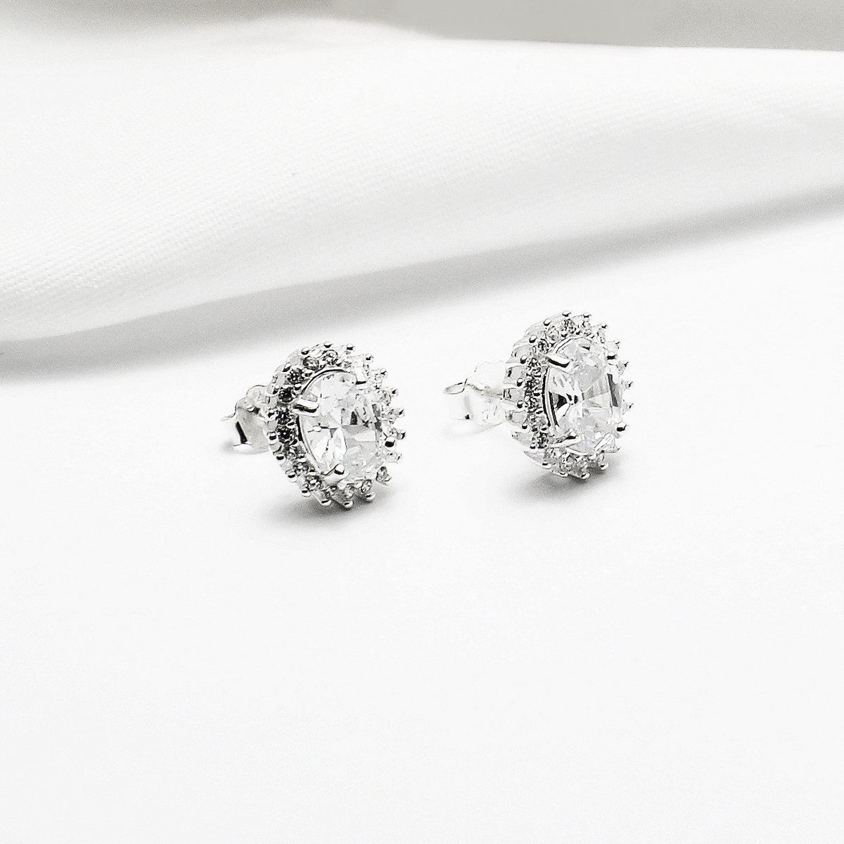 Par de brincos no formato oval em prata, cravejado com Zircônias.