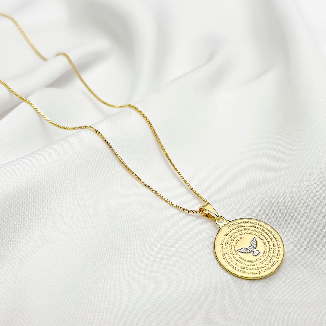 Colar com pingente de mandala com o Pai Nosso gravado e banhados em ouro 18k by Soraya Moraes. Uma peça que simboliza fé, proteção e espiritualidade com elegância.